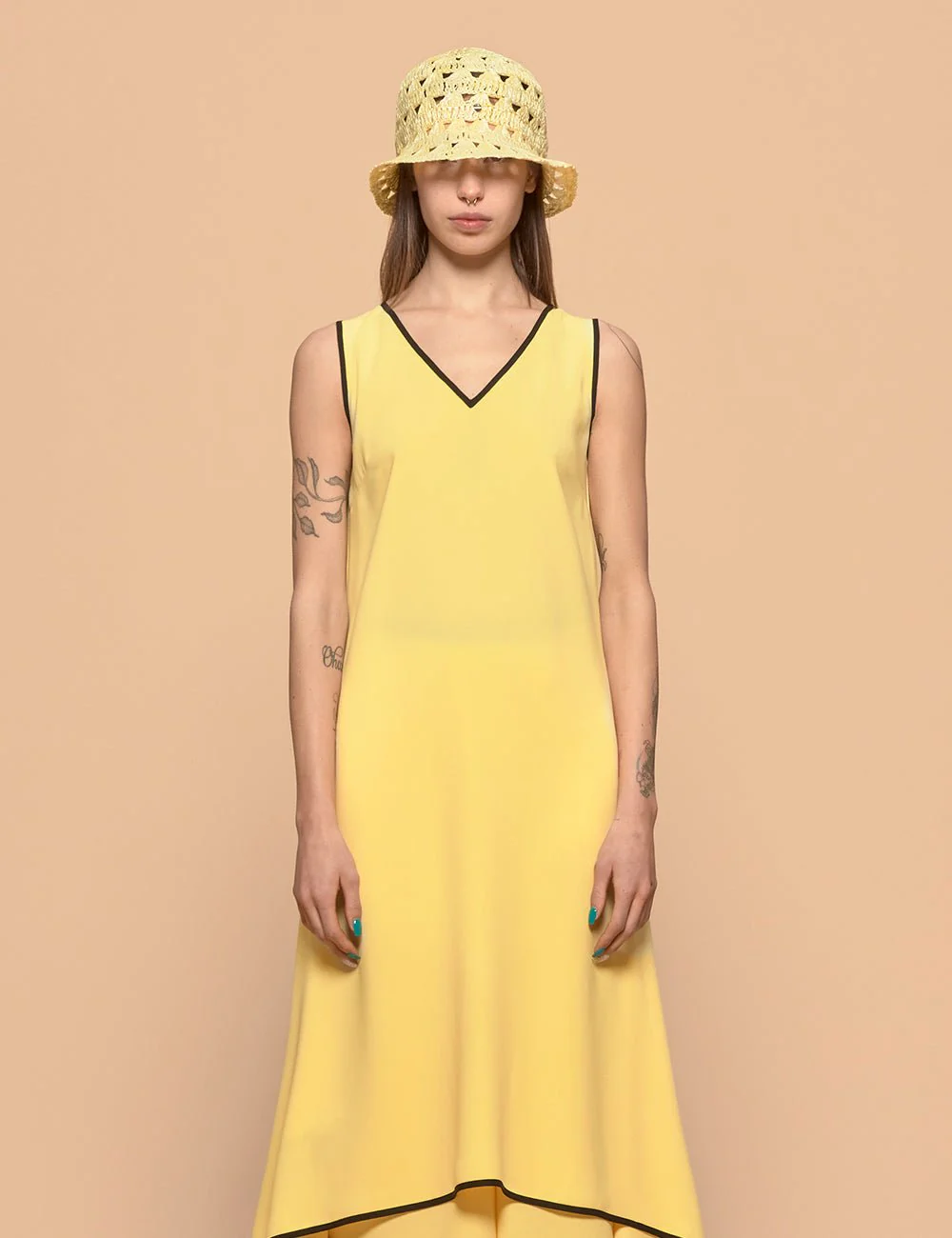Abito lungo giallo senza maniche. Presenta scollo a v e profili a contrasto neri.
