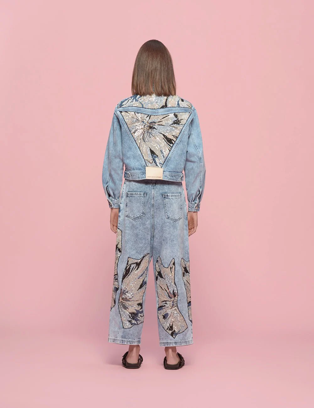Giacca in denim crop, stone-washed, sfoderato. Fit a scatoletta, spalle larghe, strutturato, maniche over in forma, polsi stretti ad un bottone. Colletto classico all’italiana, finta centrale con bottoni a vista argento. Sul corpo, gioco di tagli e applicazioni di paillettes ricamate, color sabbia e blu denim.