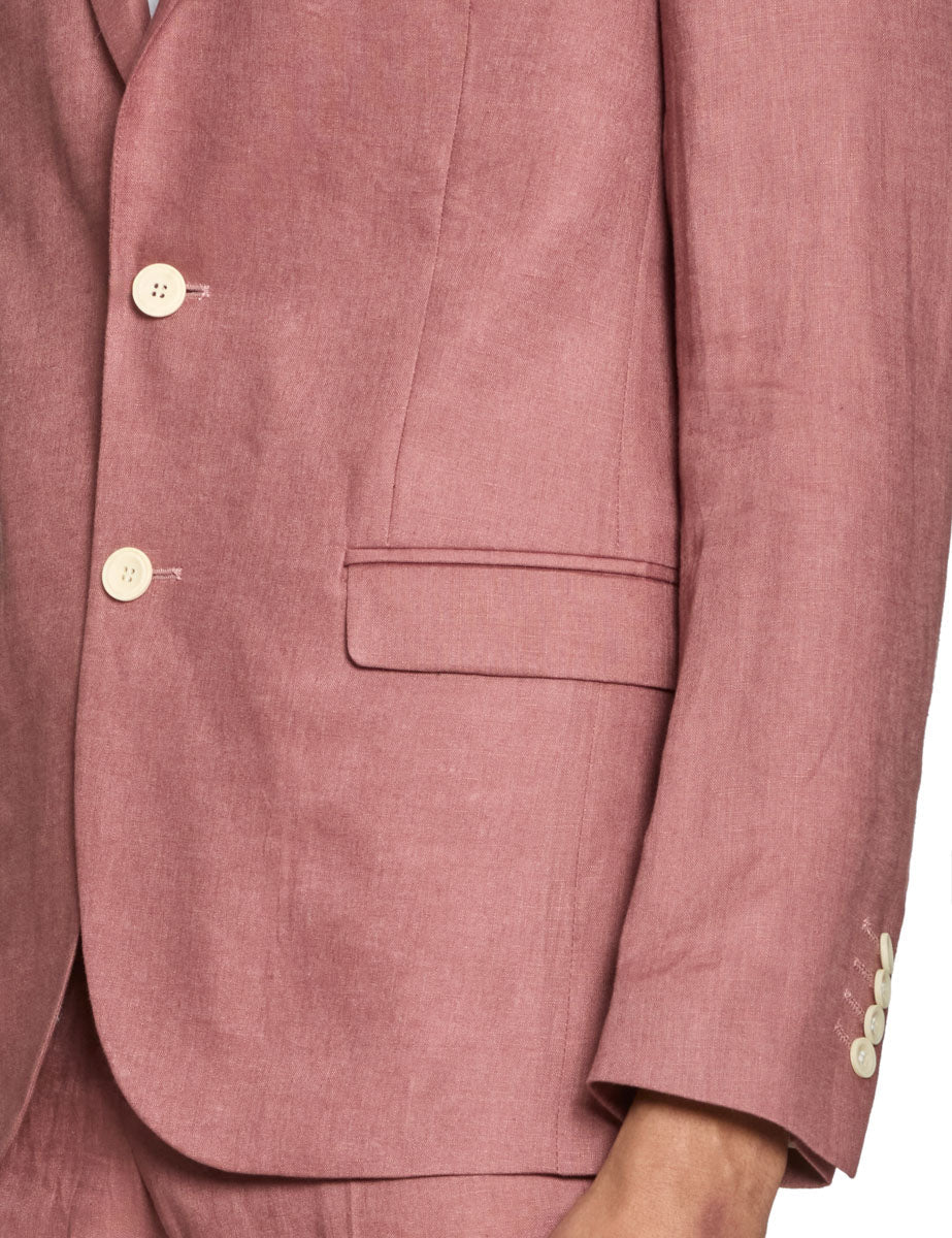 Abito in lino color malva. Giacca con chiusura monopetto con bottoni in pasta a contrasto. Collo a revers, tasche a patta frontali e a filetto al petto e chiusura polsi con bottoni in pasta a contrasto. Pantalone slim fit, chiusura frontale con gancio, zip e bottone a contrasto. Tasche alla francese frontali, stirato in piega e con passanti in tessuto.