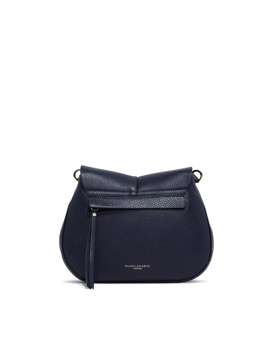 Borsa a spalla realizzata in pelle martellata color blu navy, presenta una chiusura a patta frontale e doppio scomparto interno con tasca applicata. Tasca a scomparsa posteriore, tracolla in tape regolabile ed un manico in pelle entrambi removibili.