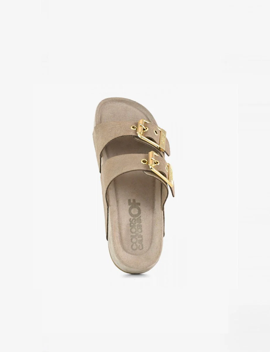 Sandalo in pelle scamosciata color sabbia, Doppi cinturini superiori regolabili con fibbie metalliche in galvanica oro e suola platform.