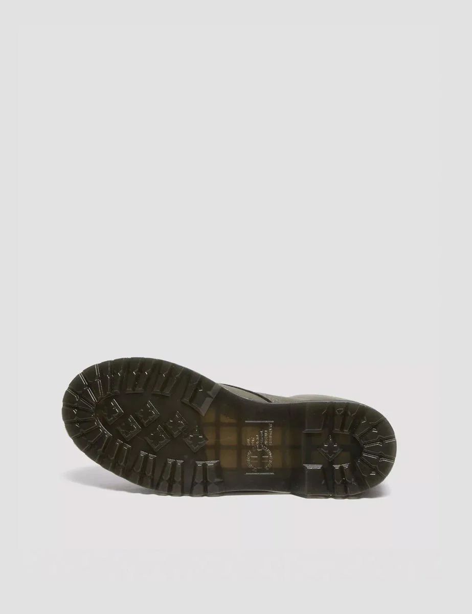 Anfibio in vera pelle scamosciata nabuk color nickel, trattata con una finitura resistente all'acqua e rivestimento interno in morbida ecopelliccia in tono. Allacciatura stringata con 8 occhielli, cuciture a vista gialle a contrasto e l'inconfondibile linguetta gialla e nera AirWair sul tallone, punta tonda.