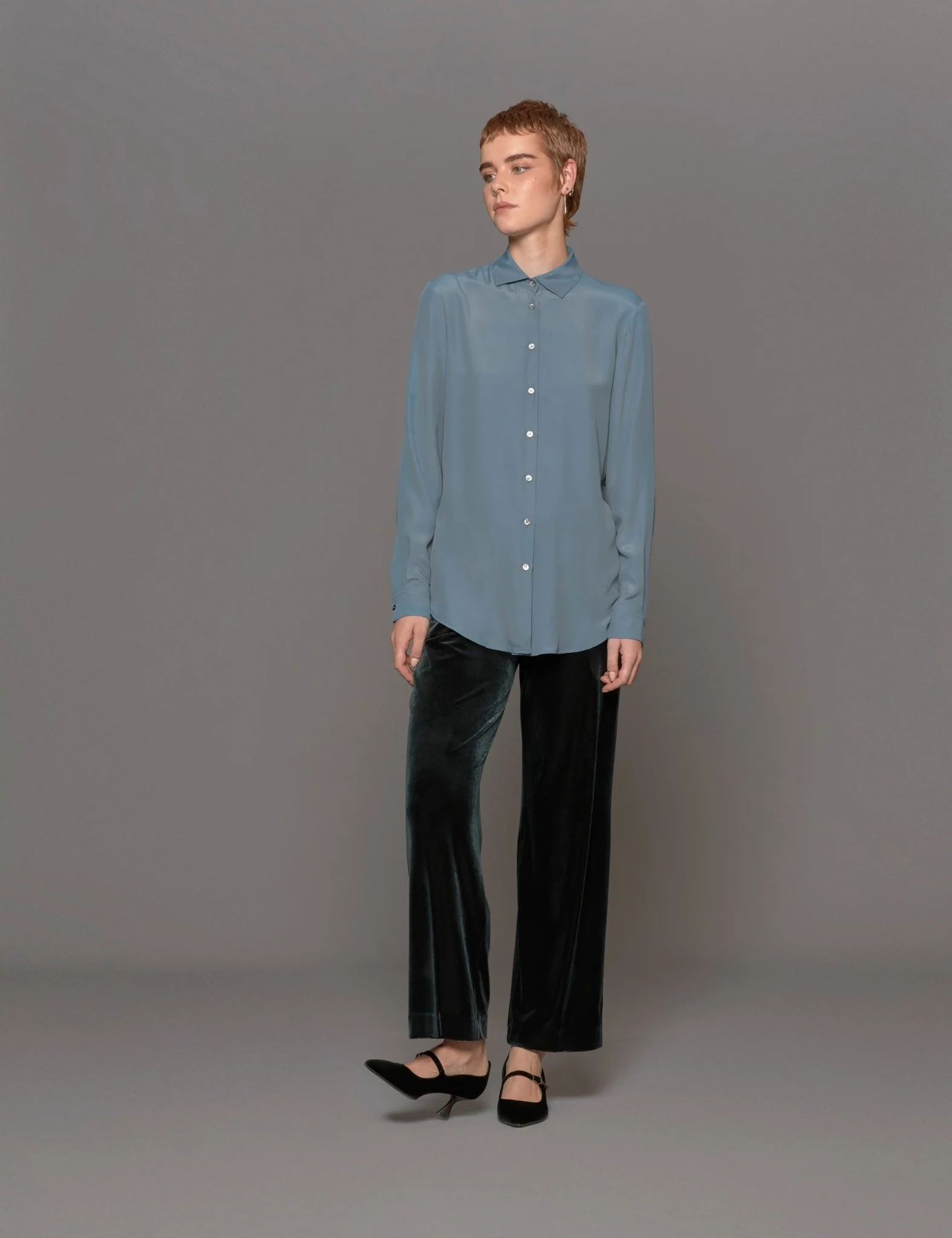 Camicia a maniche lunghe in misto seta color polvere. Presenta colletto regolare e chiusura tramite bottoni.