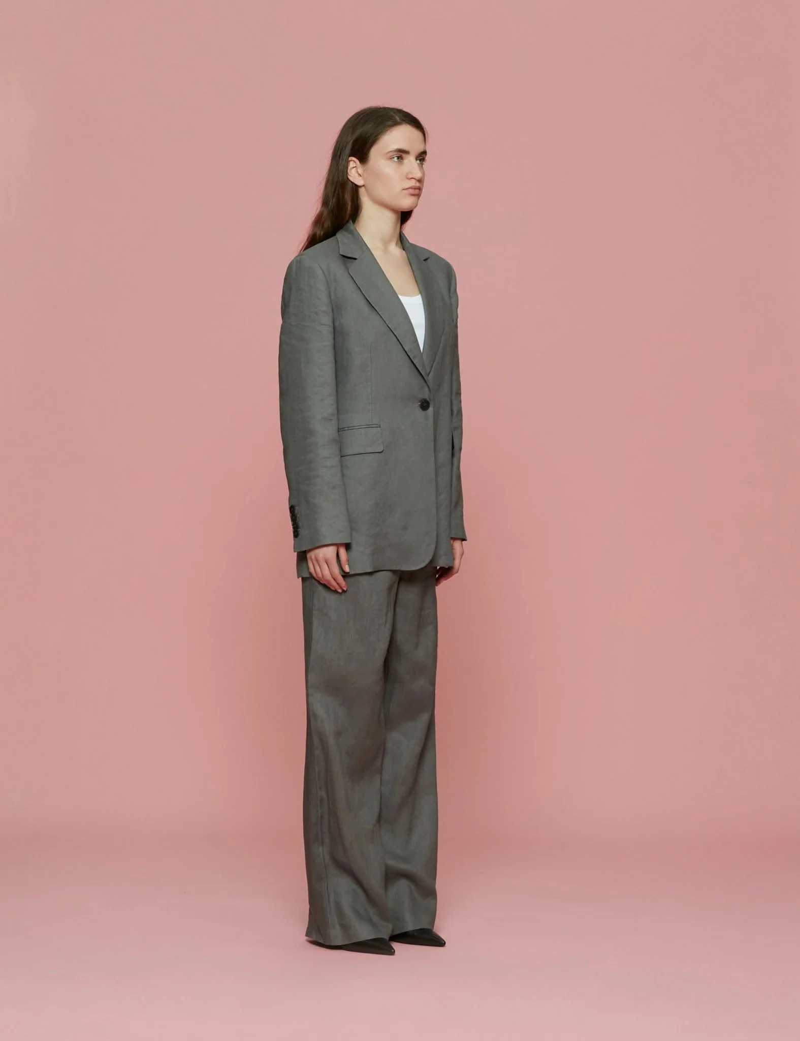 Blazer monopetto in 100% lino di color piombo con colletto e rever regolari. Presenta taschini con patta.