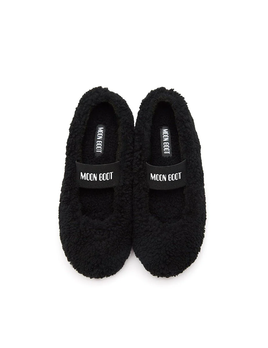 Ballerina slip-on in shearling color nero, motivo cinturino elastico frontale in tono con logo a contrasto bianco. Suola in gomma.