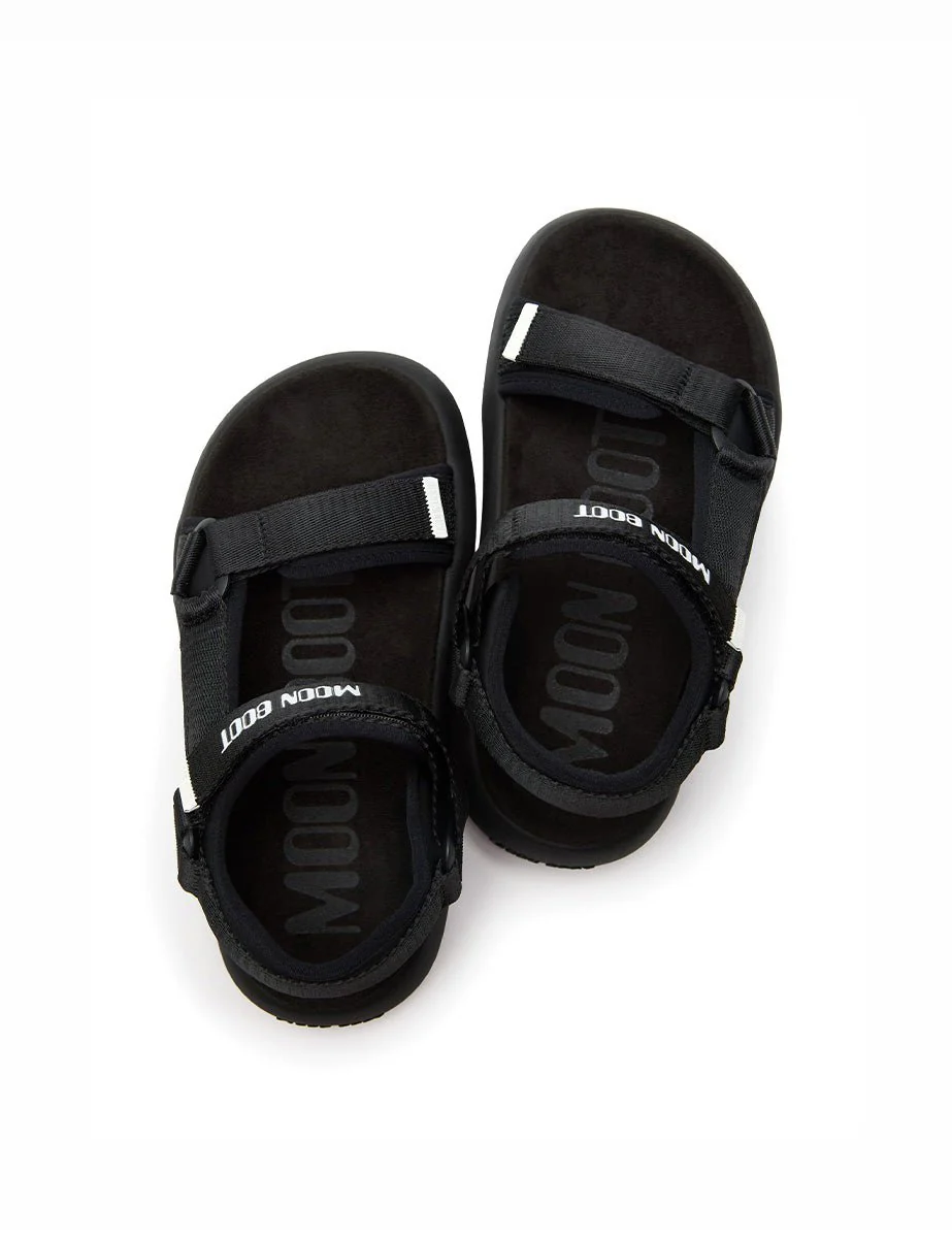 Sandalo slip-on color nero, cinturini regolabili con velcro e logo stampato a contrasto. Battistrada con marchio in gomma termoplastica.