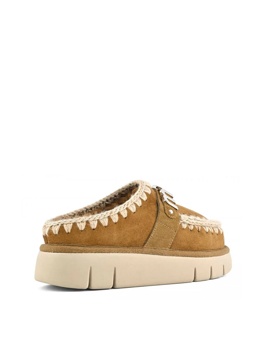 Clog in vera pelle di montone double-face color cognac, cuciture a contrasto in filo di lana color crema ed elemento metallico portalogo color silver. Plantare imbottito in pelle, suola leggera in EVA e gomma e punta tonda.