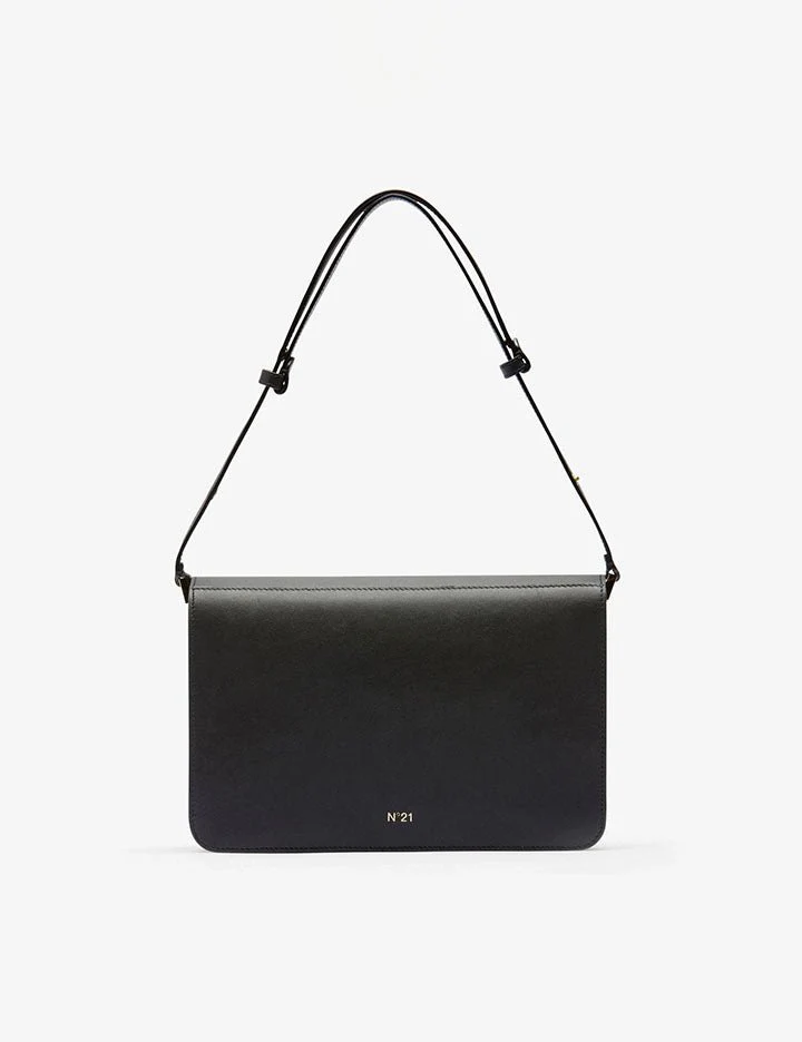 Borsa a tracolla Edith nera realizzata in pelle con placca logo N21 inciso. Presenta tracolla regolabile, tasca frontale, marsupio e chiusura magnetica. All'interno ha fodera in tessuto scamosciato con scomparto a zip.
