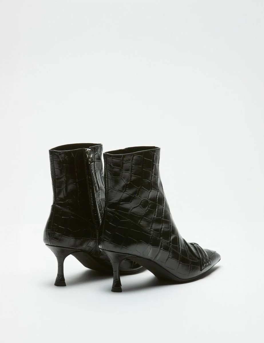 Stivali alla caviglia neri con stampa coccodrillo, tacco kitten e chiusura laterale con zip a scomparsa. Decorazione con fiocco sul davanti e punta stretta.