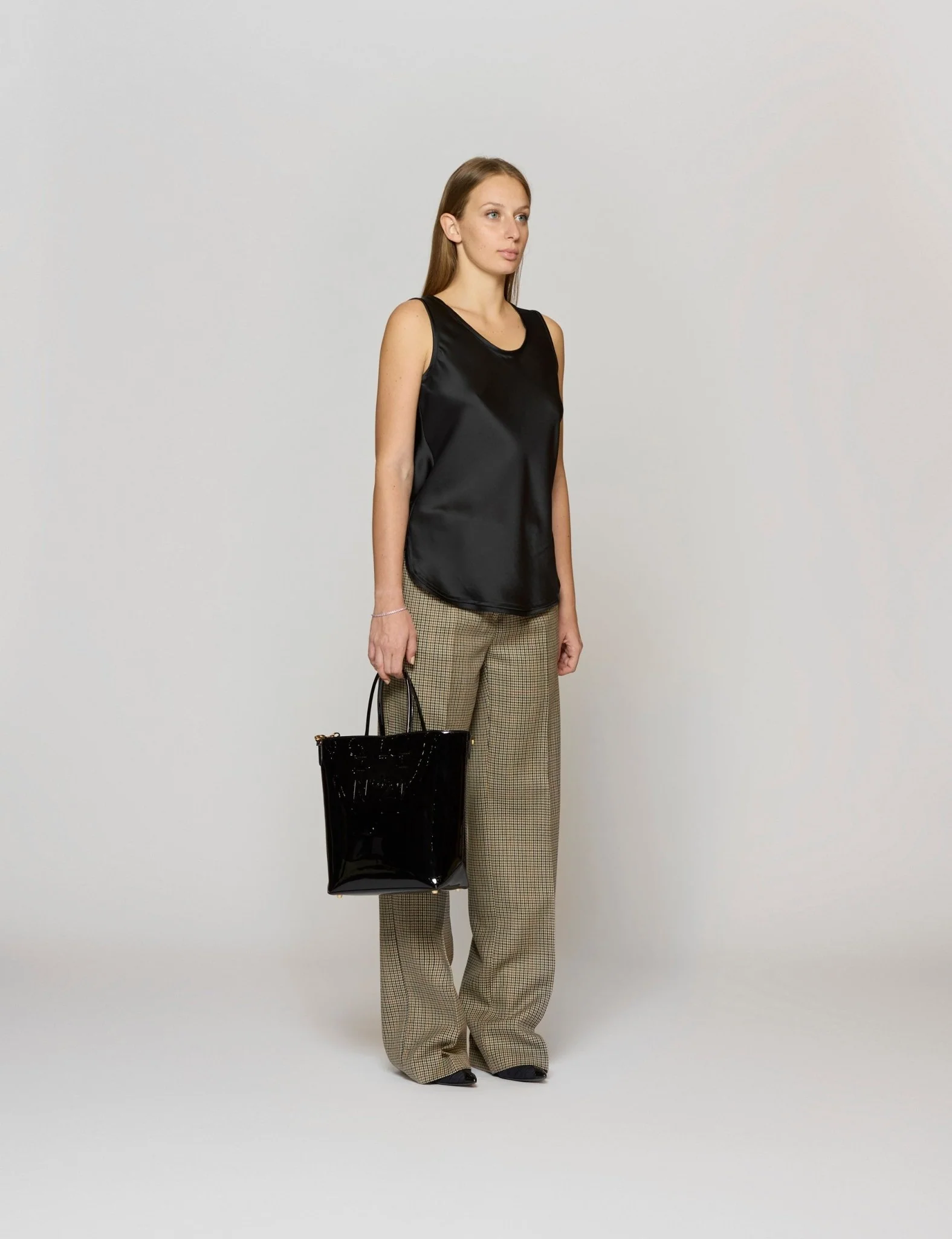 Pantaloni fit regluar lunghi con trama pied de poule sui toni del beige e nero. Presenta cinturino con passanti, tasche frontali e due tasche posteriori a filetto con dettagli bottone.