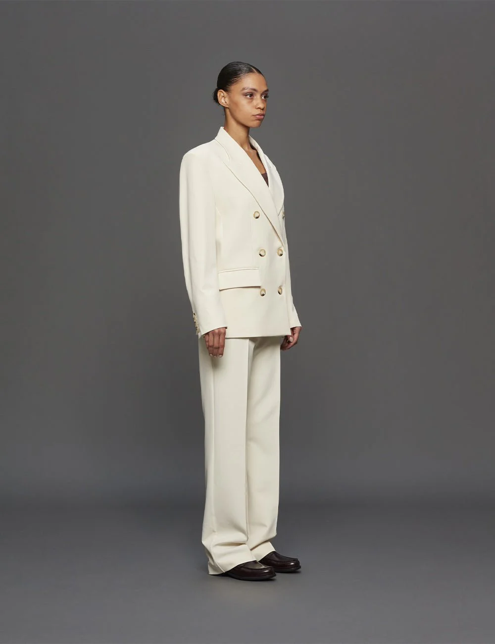 Blazer doppiopetto in tessuto tecnico color ghiaccio. Fit over, leggermente sagomato, scollo profondo, ampio rever a lancia stondato, spalle strutturate, larghe ed imbottite, manica in forma con spacco sul polso a quattro bottoni. Chiusura doppiopetto a quattro bottoni corno, altri due solo decorativi. Due tasche orizzontali a filetto con patta sul davanti. Fodera ton-sur-ton bianca.