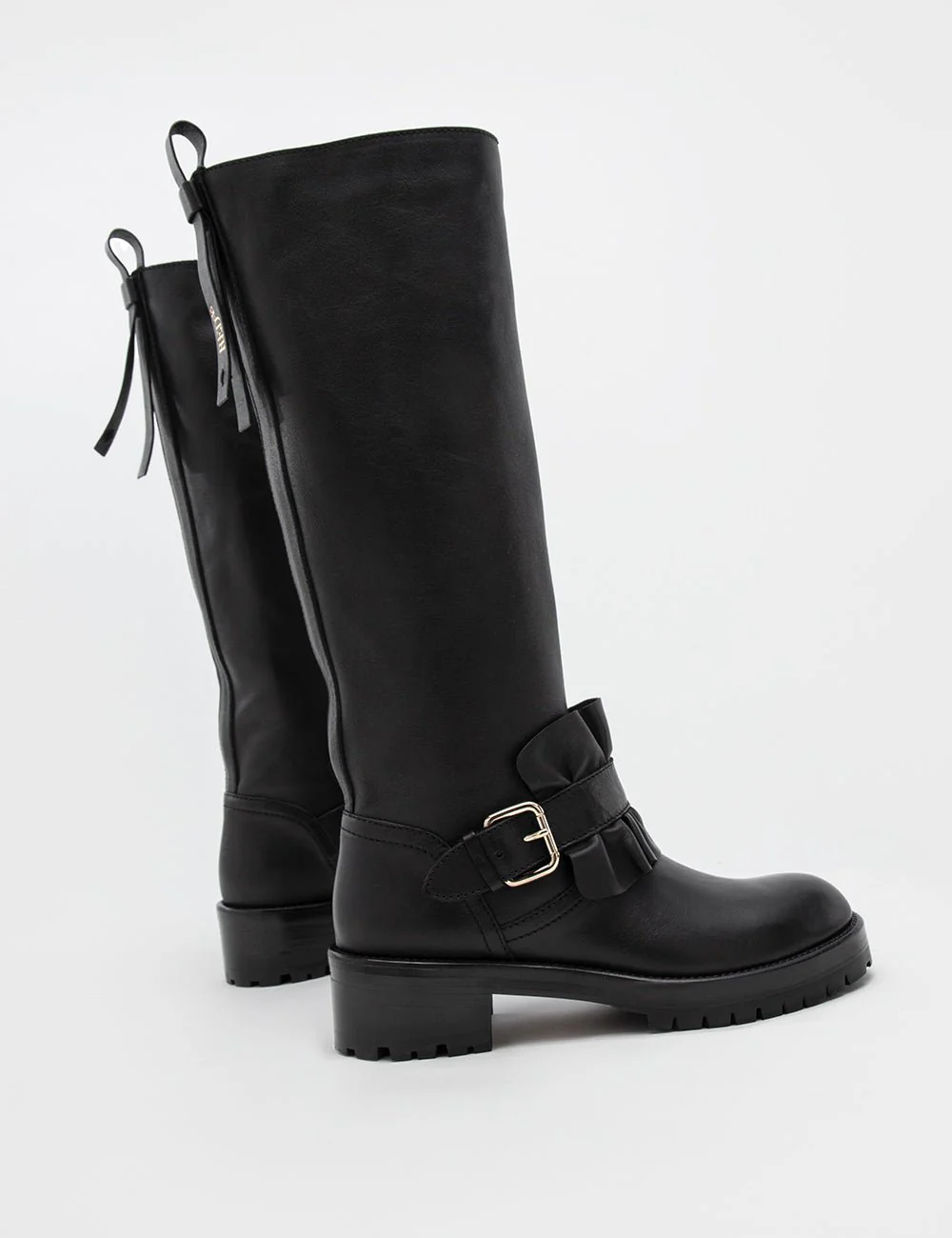 Bikers boots alti in pelle nera, punta tonda. Dettaglio fiocco logato posteriore e cinturino con rouches e fibbia galvanica color argento nella parte anteriore. Suola di gomma nera con tacco basso. Soletta interna logata.