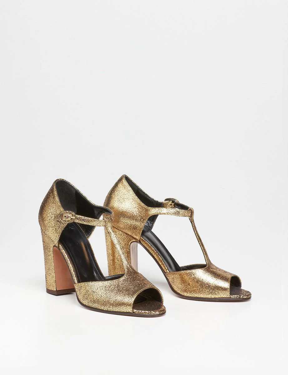 T-strap spuntata in vera pelle con lamina effetto crinkle oro, cinturino alla caviglia con fibbia foderata nella stessa pelle laminata, tacco largo.