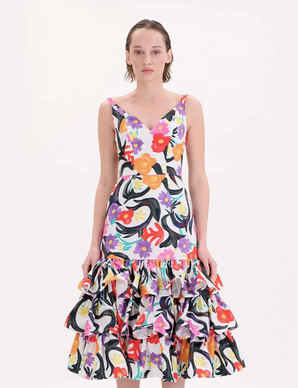Abito in popeline elastico misto cotone, stampato disegno pittorico floreale, base bianca con mix di colori rosso, arancio, lilla, rosa, giallo e menta. Fit accostato, senza maniche, sinuoso scollo a V, gioco di righe sul corpetto che aiutano evidenziare e snellire il punto vita, taglio in vita, gonna longuette dritta con applicazione di tre balze arricciate che la rendono svasata sul fondo. Sul retro profondo scollo tondo con chiusura zip invisibile.