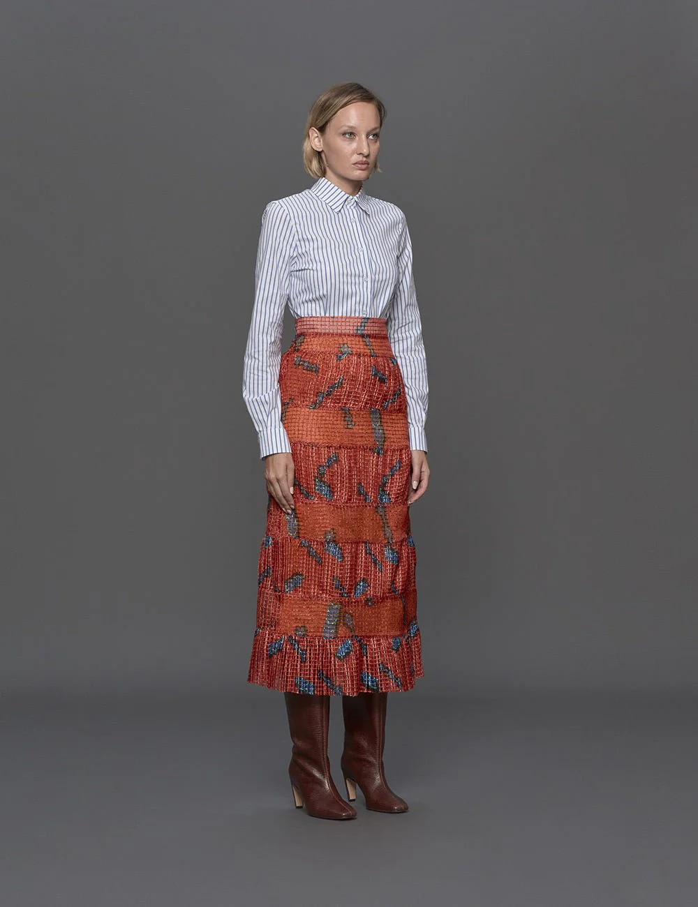 Gonna longuette in organza plissè trama check, stampa macura fondo arancione con accenti blu, foderata con tulle stretch ton-sur-ton. Fit dritto, design a bande, chiusura con zip invisibile nel fianco.