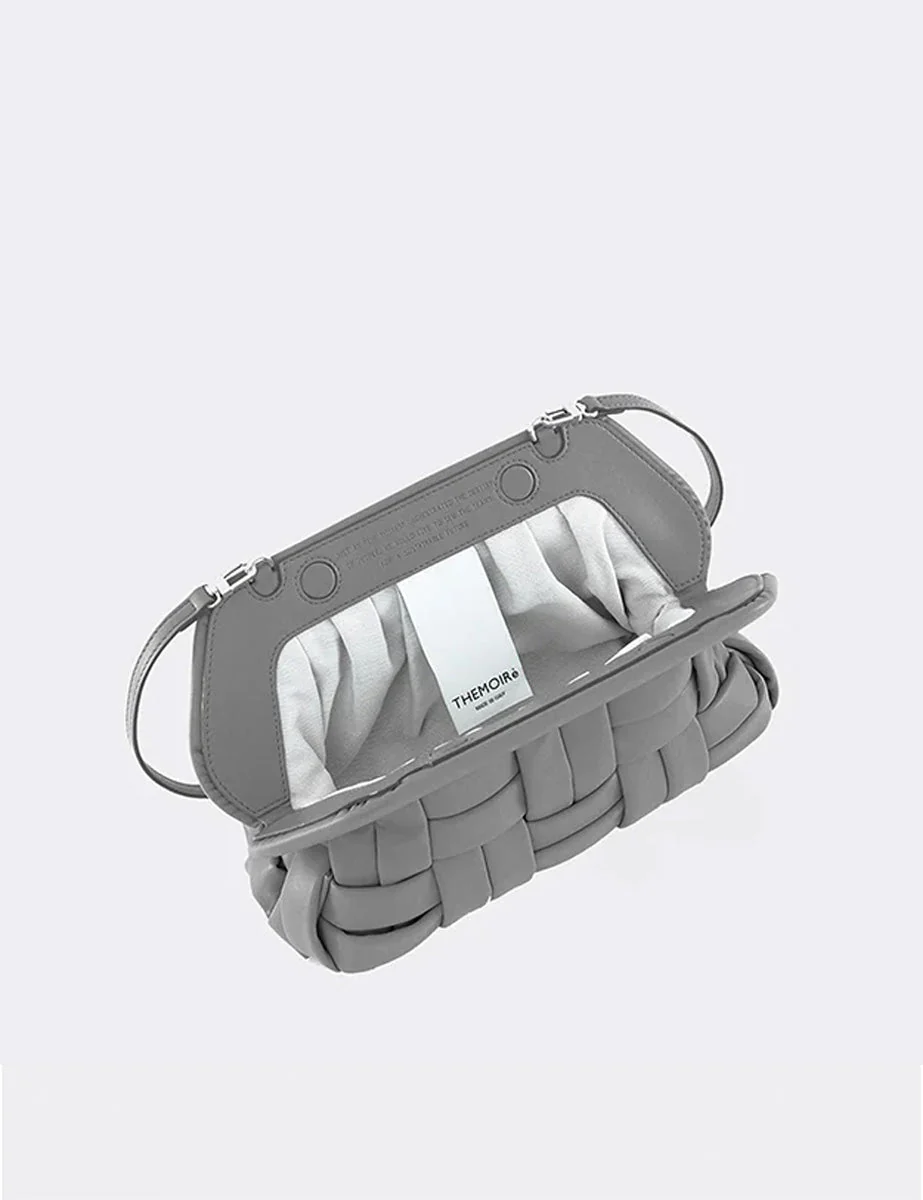 Realizzata nella variante color grigio chiaro, questa borsa presenta un design stondato con motivo a intreccio, un unico scomparto interno, chiusura magnetica e tracolla regolabile e rimovibile.