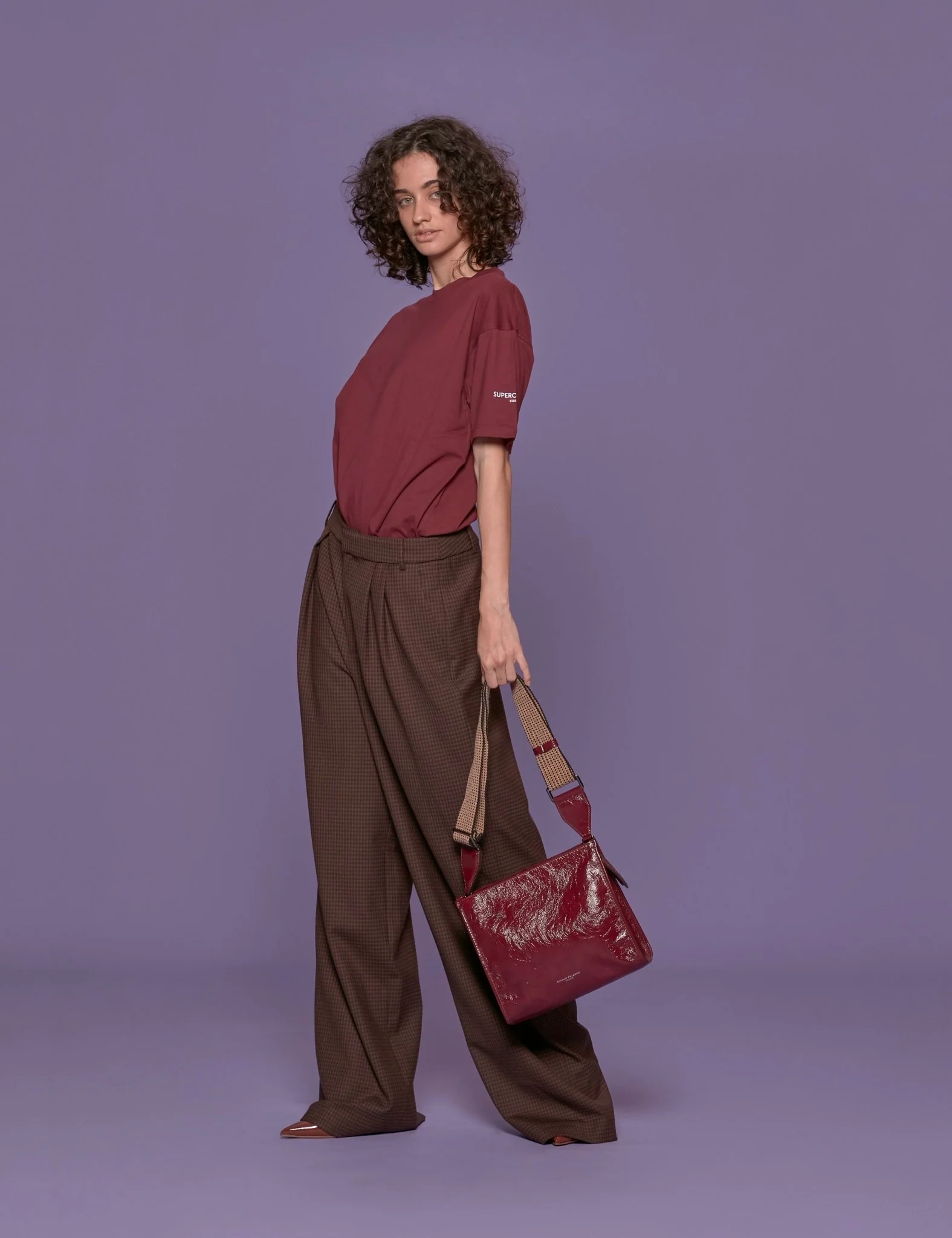 Pantalone Stella in misto lana con trama a quadretti marrone. Presenta cinturino con passanti, cavallo basso, pens e taschini sul davanti, tasche a filetto sul dietro. Chiusura tramite bottone e zip.