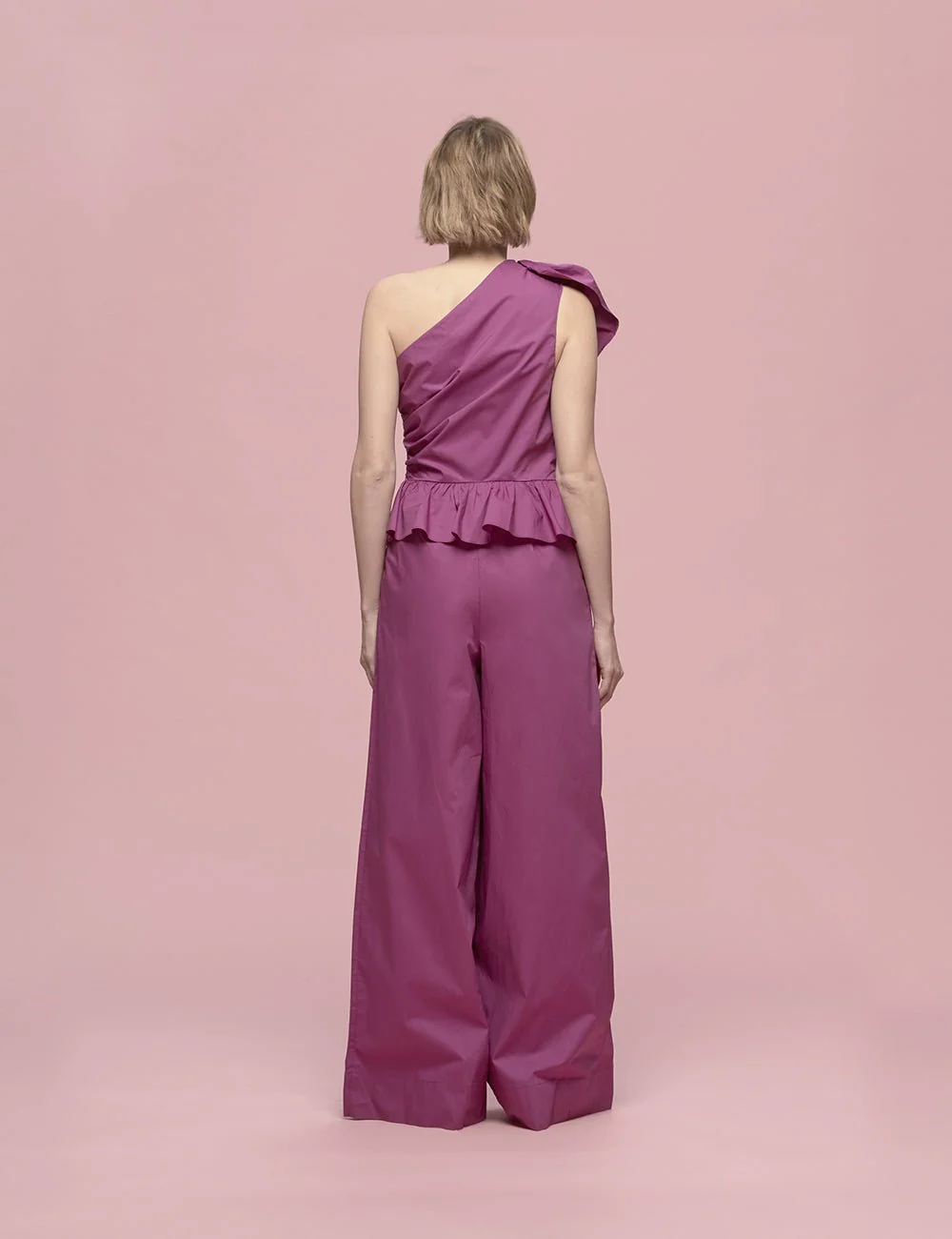 Tuta Solana monospalla in popeline di cotone color viola magenta. Fit svasato, corpino attillato con arriccio sul fianco accollato con monospalla. Gioco di balza obliqua asimmetrica e orizzontale in vita, pantapalazzo ampio e lungo con arriccio.
