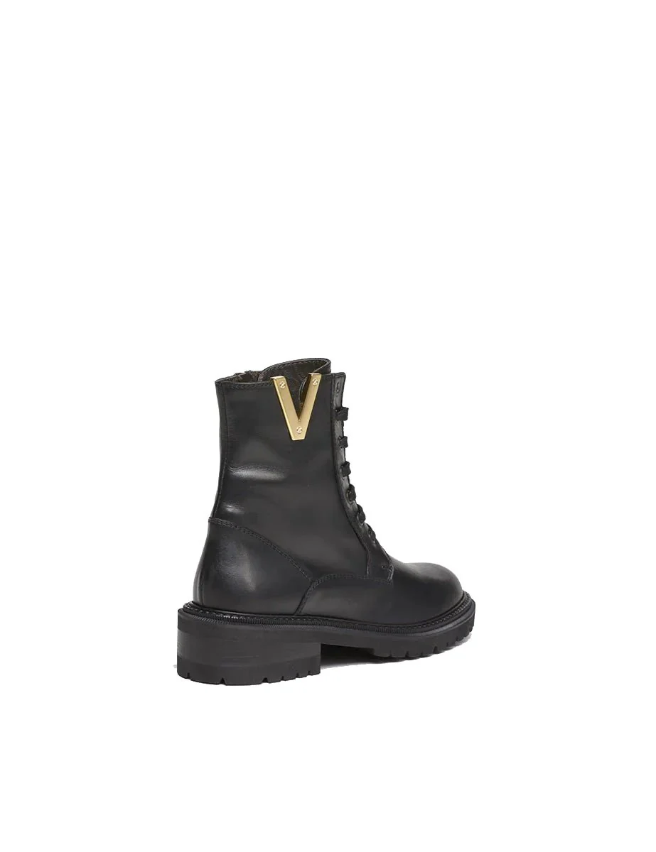 Anfibio in vera pelle nera stringato con zip laterale, cuciture in tono, accessorio portalogo metallico a “V” color oro, tacco largo e punta tonda.